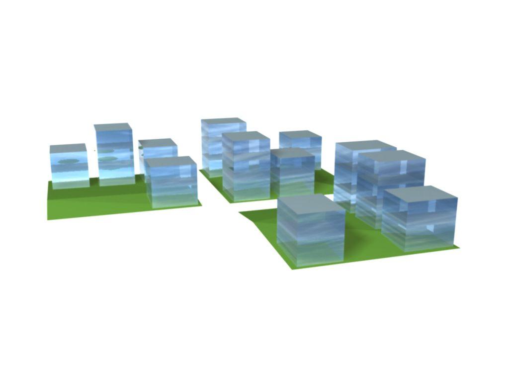 The three lattice patterns have initiated a process of differentiation in scale and sizing of the new building types as they create adjacencies, contrasts and continuities. Their uniqueness will be generated by the cross-movement flow of the landscape across and around the spits and islands. Each building type needs to have flexibility to allow it to stretch, to be compressed or to be truncated to address both cultivated and wild landscapes, esplanades, water’s edges and banks, to be positively affected and interpreted by a sometimes dominant freer geometry of the landscape. This strong effect of the naturalized landscape sets up a new open-ness in the building typologies, where the open volume created by the built type is of over-riding importance – how systems of open-ness across the spits are created north/south and how the long view is framed in the east/west direction. At the immediate scale, the framing of new public spaces and the new landscape must be accompanied by an idea of ‘interpenetrability’ – the movement of the landscape into the building, creating a lively space of dialogue between inside and outside, making that middle realm of public space through the blurring of edges.