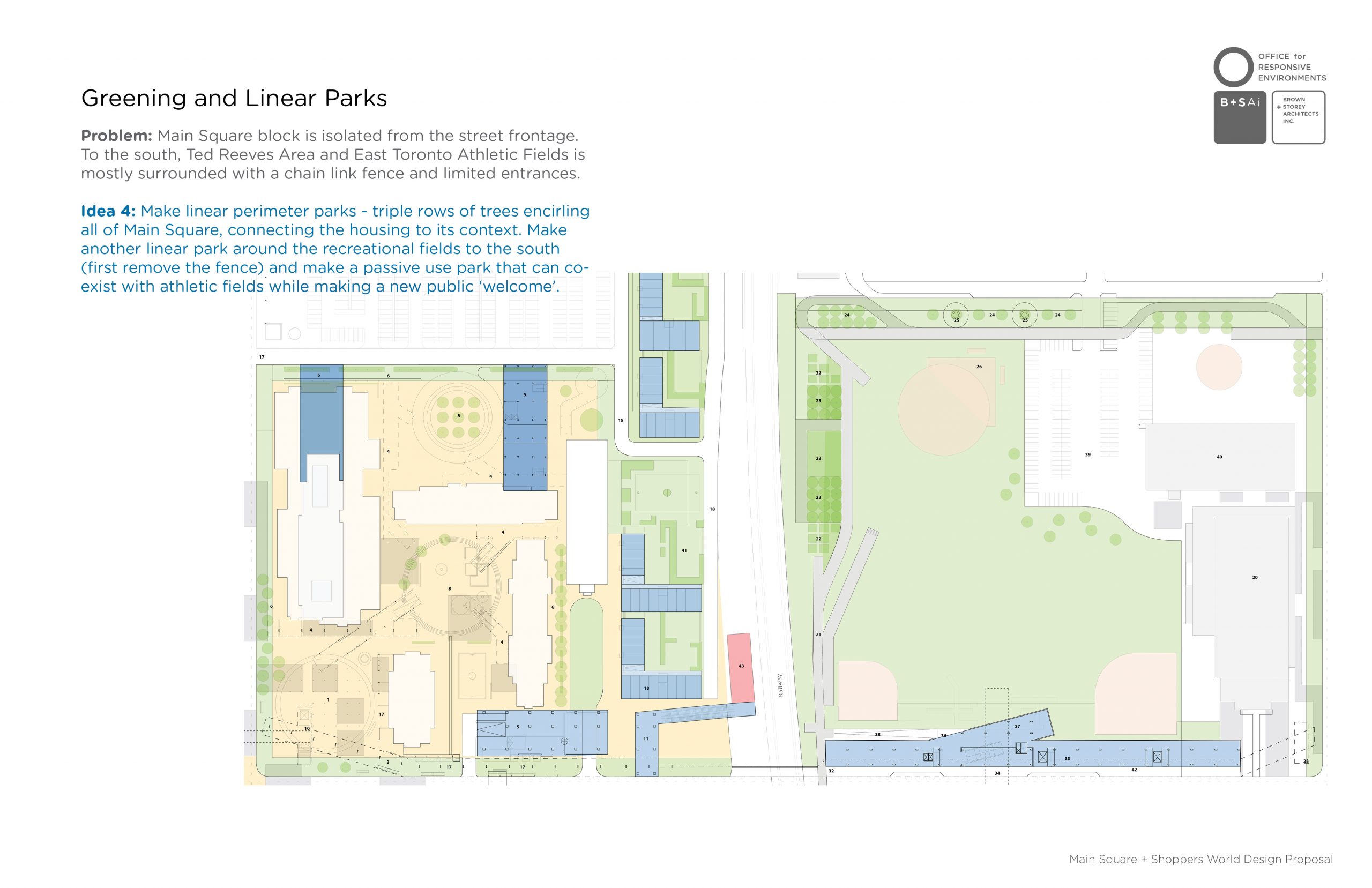 Idea 4: Make linear perimeter parks- triple rows of trees encircling all of Main Square, connecting the housing to its context. Make another linear park around the recreational fields to the south (first remove the fence) and make a passive use park that can co-exist with athletic fields while making a new public “welcome.”