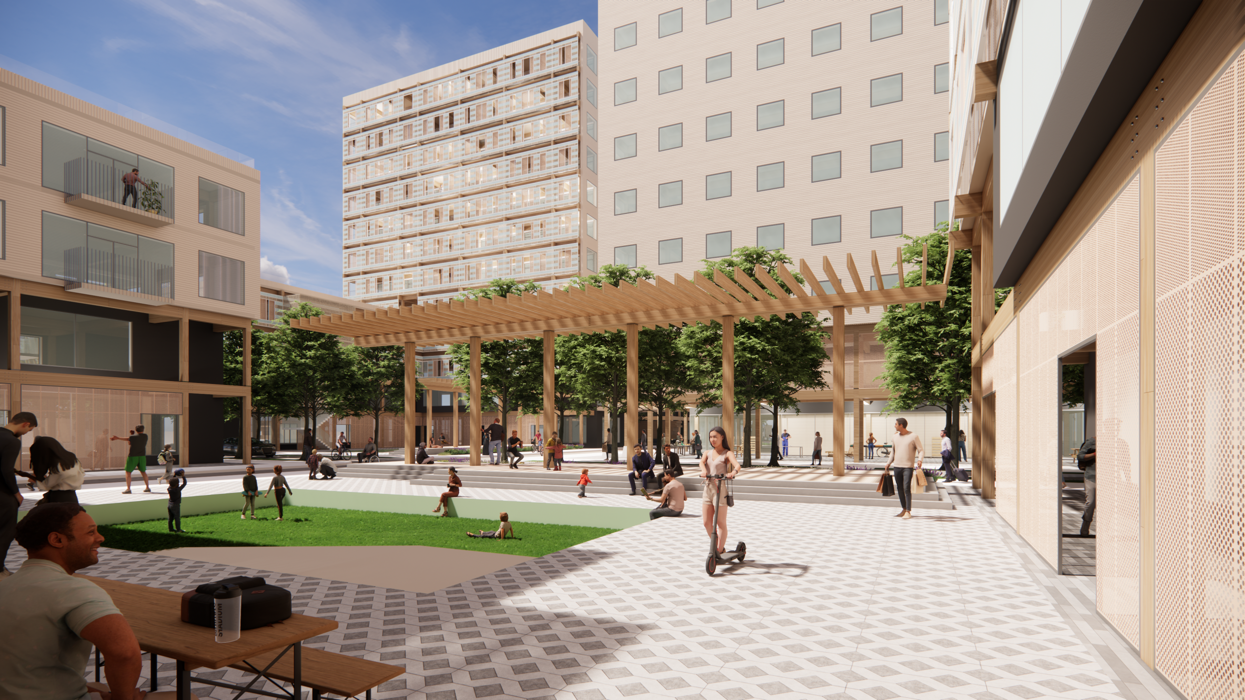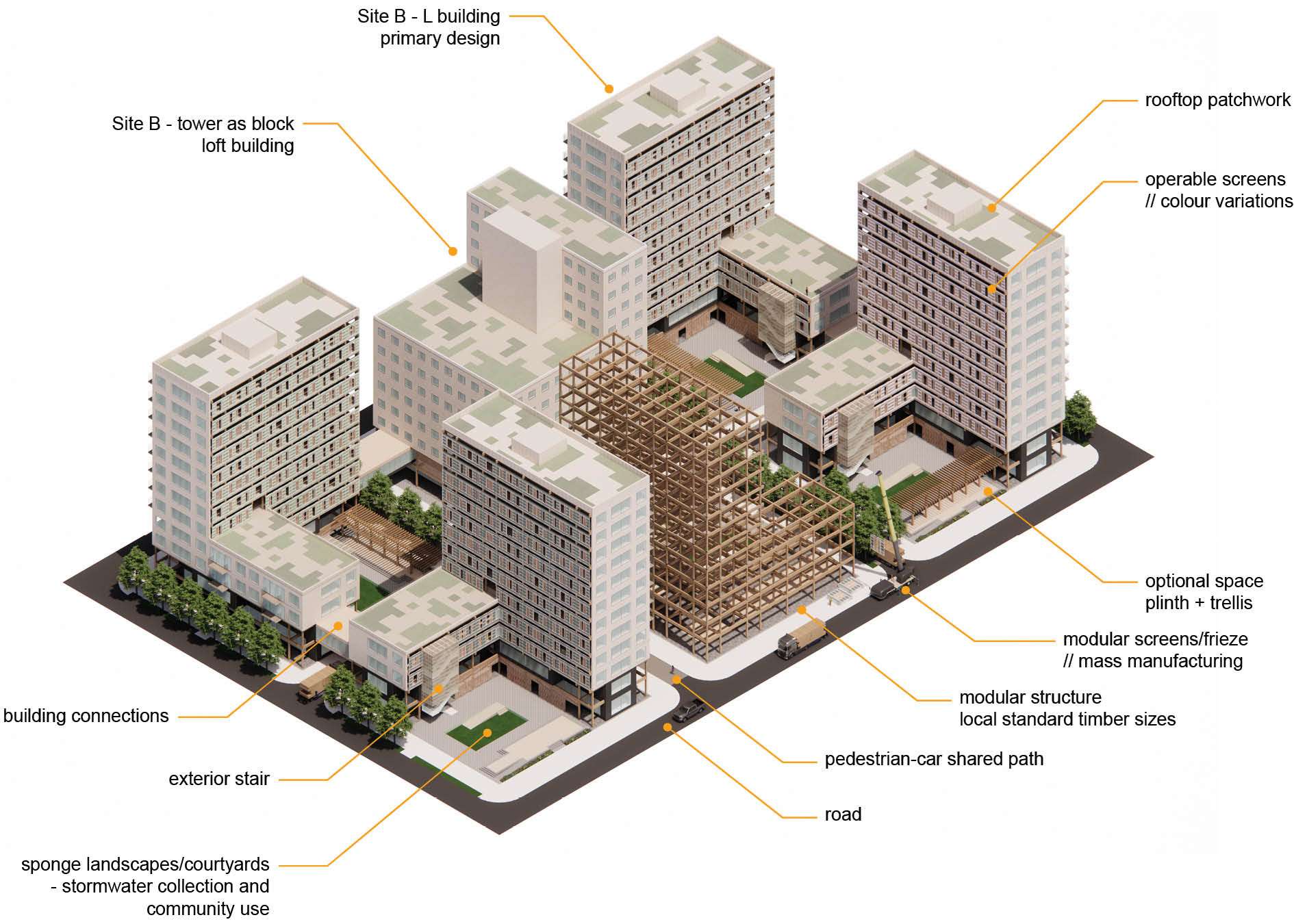 Timber is central to the project, specified across multiple building typologies: tower-like courtyard apartments, loft-style block buildings, and hybrid mid-rise forms. Site B, together with sites A, C, and D, anchors a larger cluster system, extending connections to neighbouring islands and embedding itself in a dynamic, relational urban fabric.