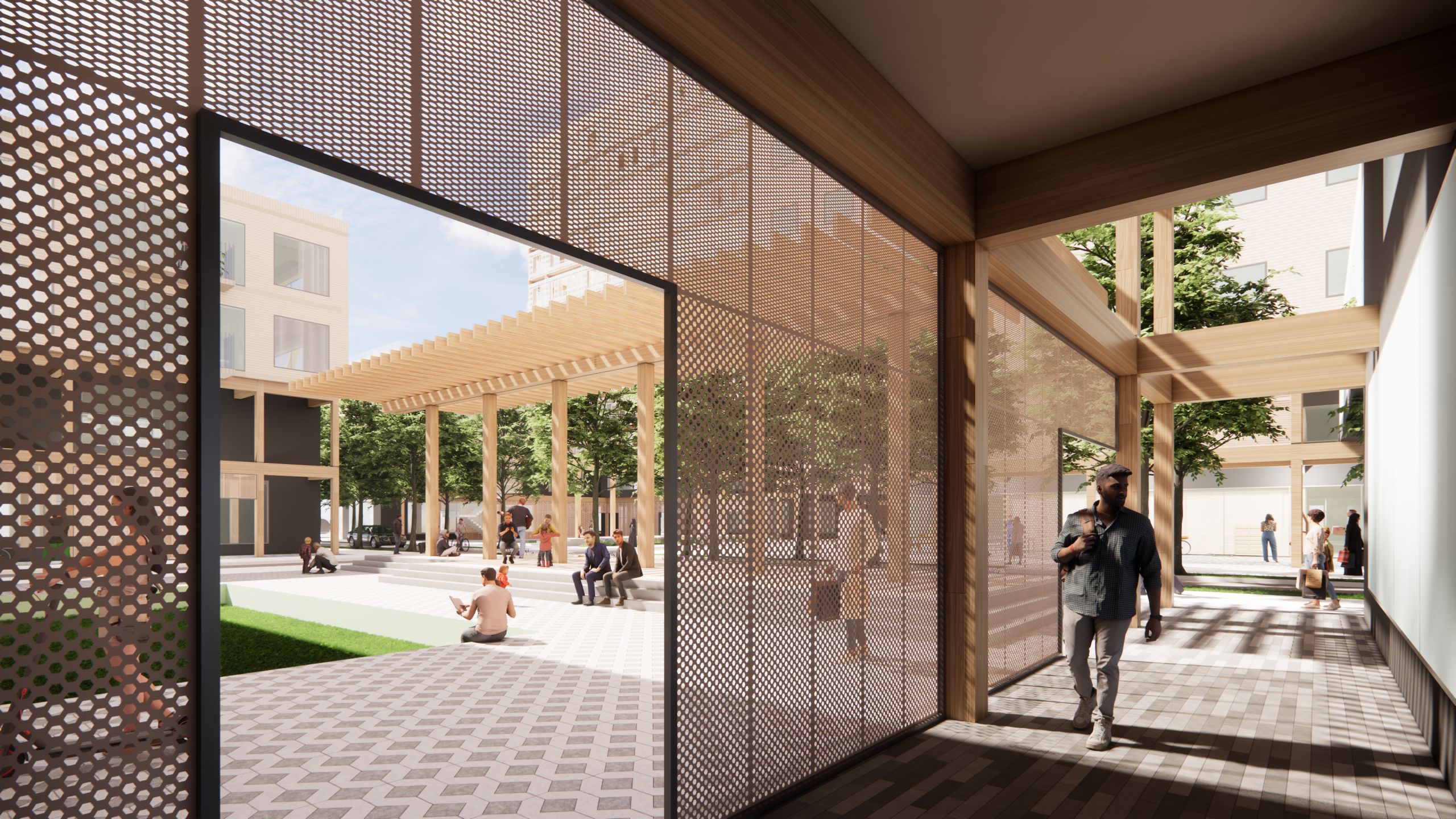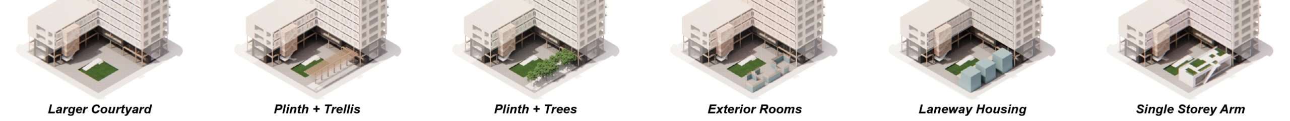 On the block’s north side, two L-Shaped Courtyard Buildings frame a shared collective space. Each L-type is defined by a taller north-facing wing and a lower street-facing leg, with open sides oriented inward. Circulation is organized through single-stair towers with open internal walkways overlooking the courtyards. At the hinge of each L, stair and elevator cores integrate with screened façade elements that act as environmental modifiers.