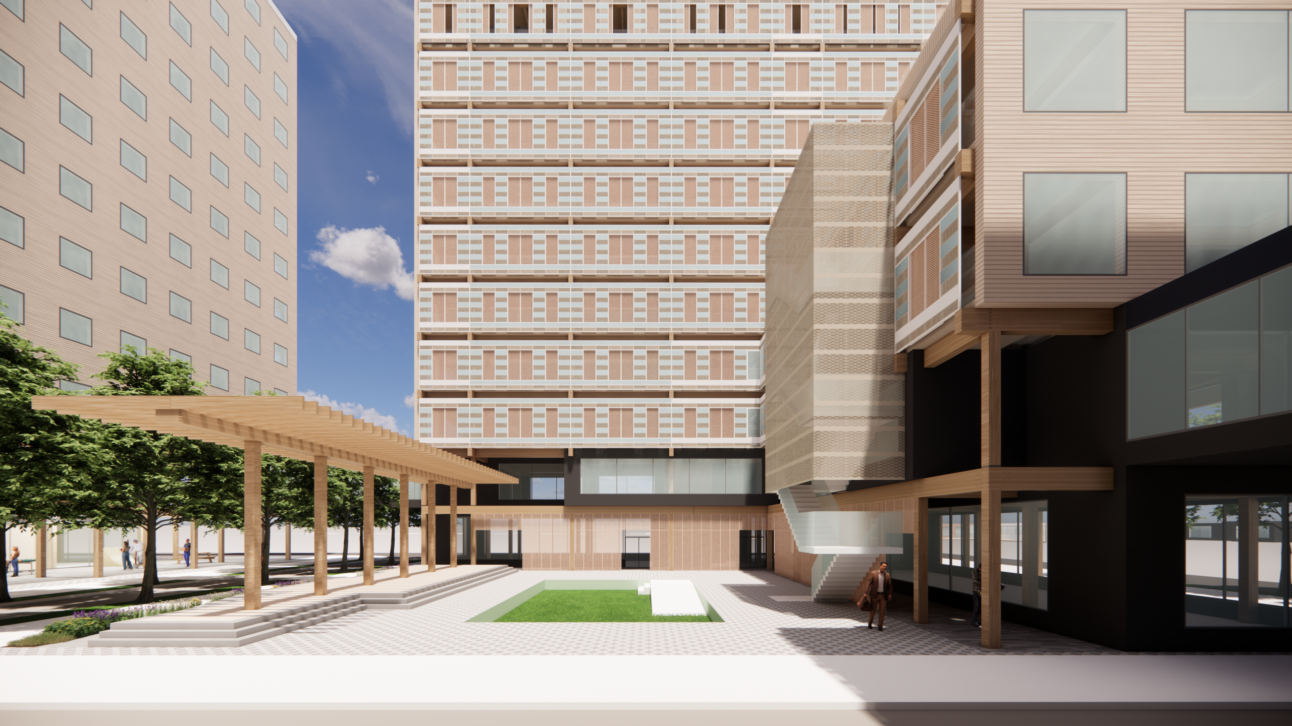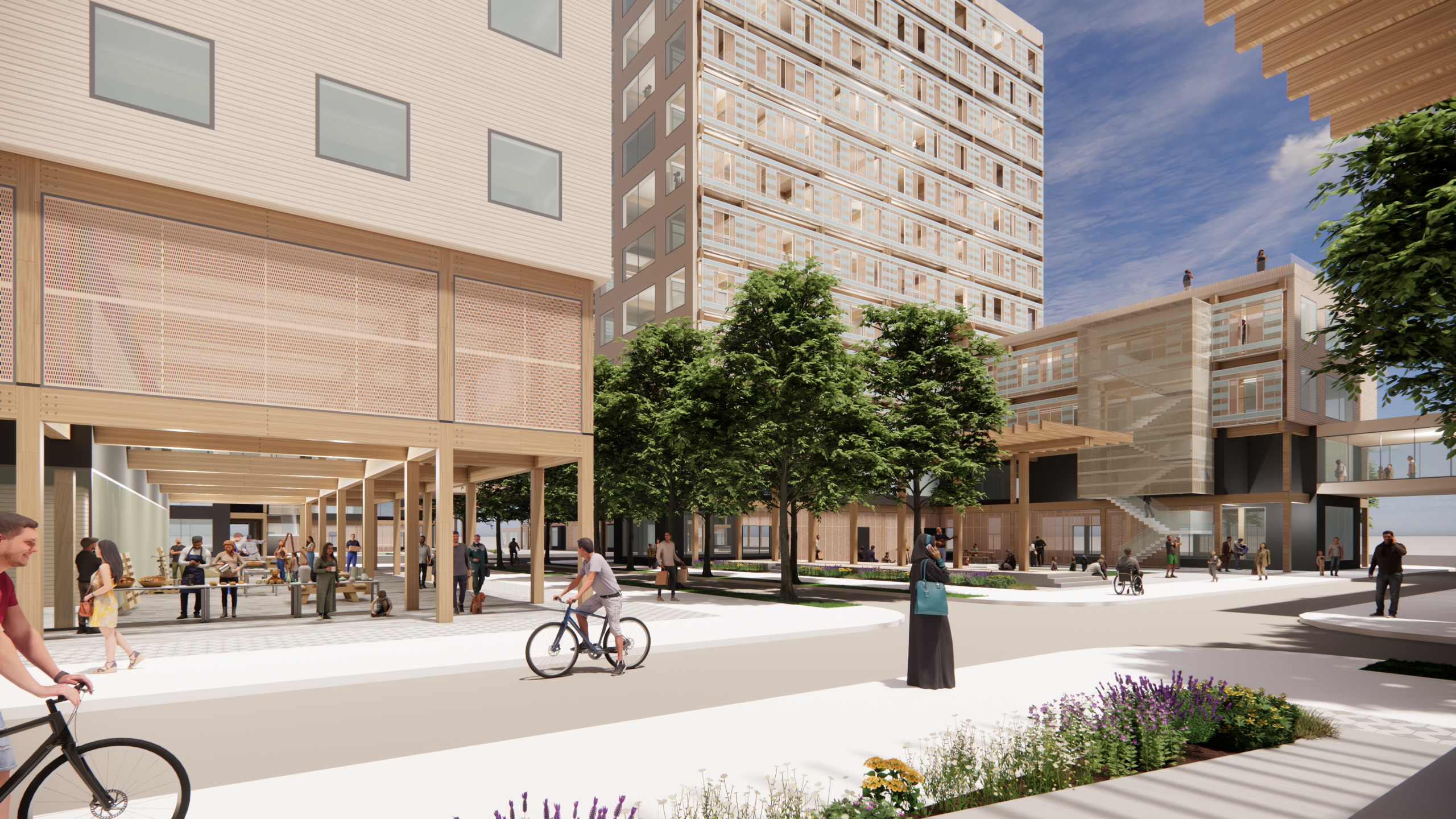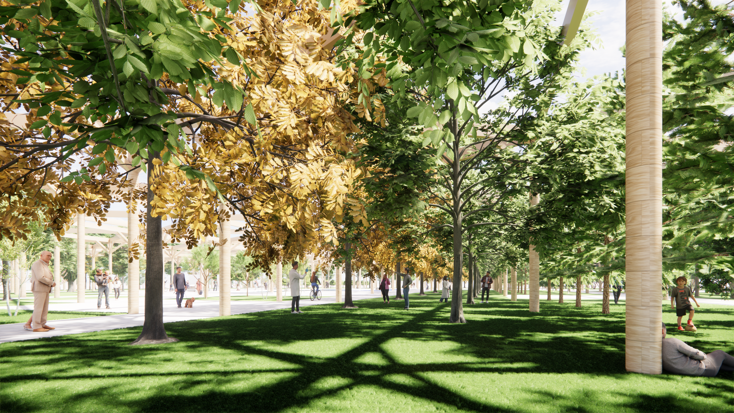 At the city’s transit hub, boundaries between interior and exterior space are pushed to an extreme. Defined by three concentric circular forms—including a tree library—the hub becomes both an infrastructural node and a celebration of timber architecture.