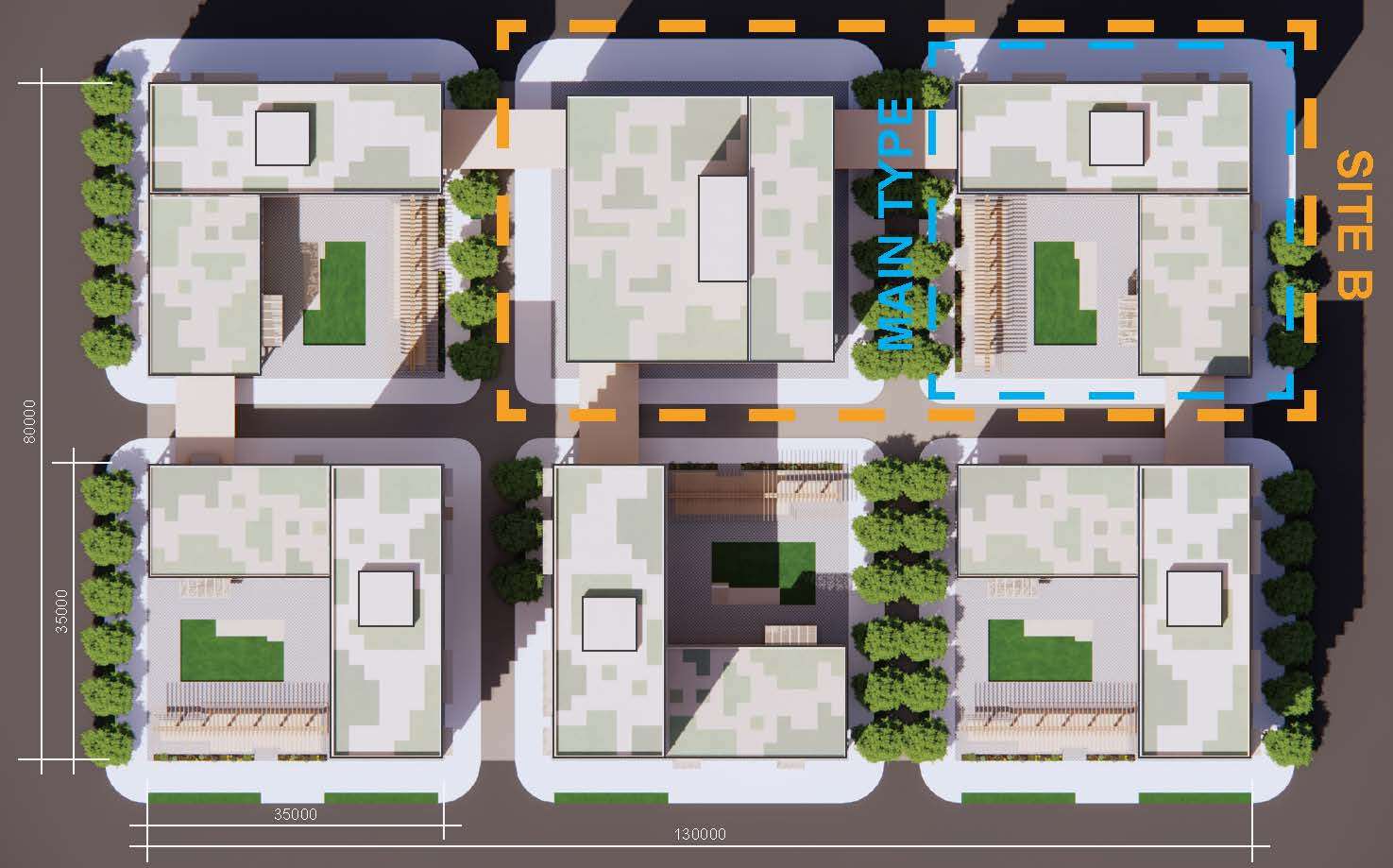 Site B demonstrates this vision at the block scale, a city within a block. The site footprint extends across the full 130m length of the block and is subdivided into 35m x 35m modules, separated by two 12.5m-wide pedestrian streets. This module is mirrored across the east–west axis, reinforcing walkability and permeability within the larger block.