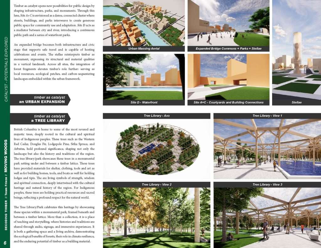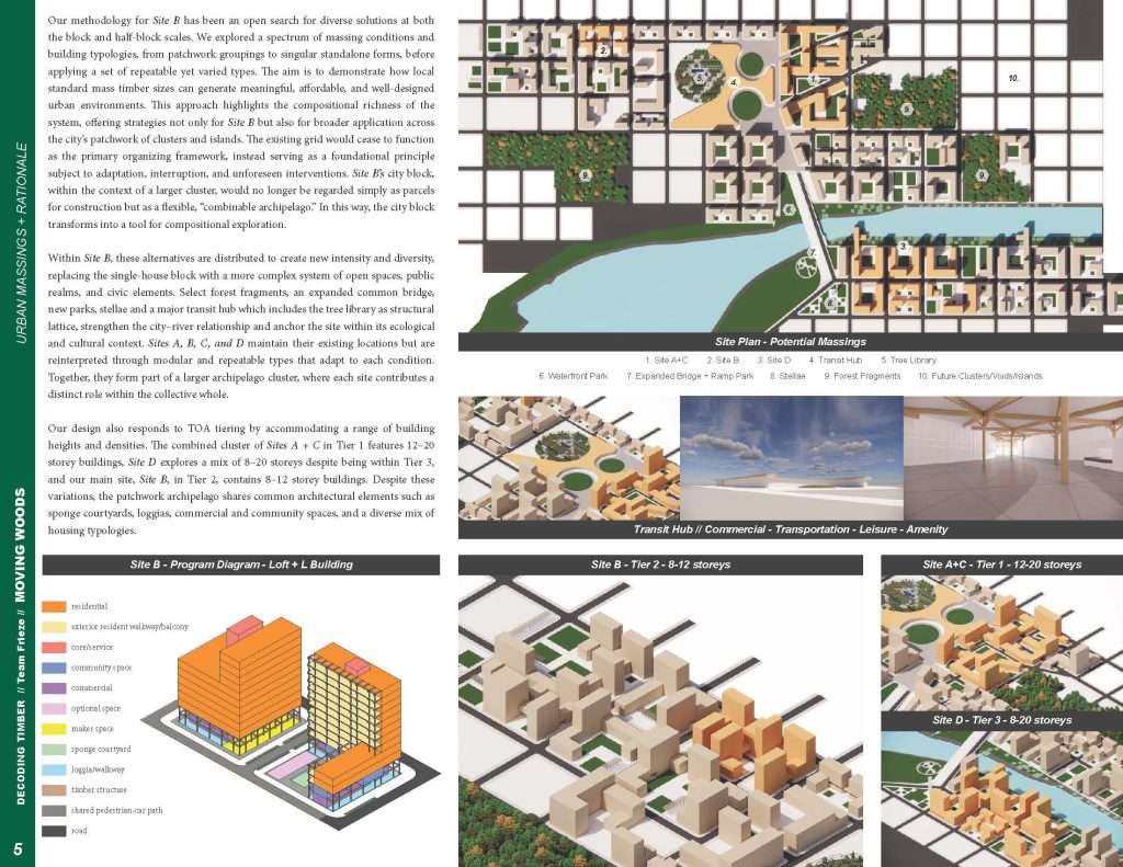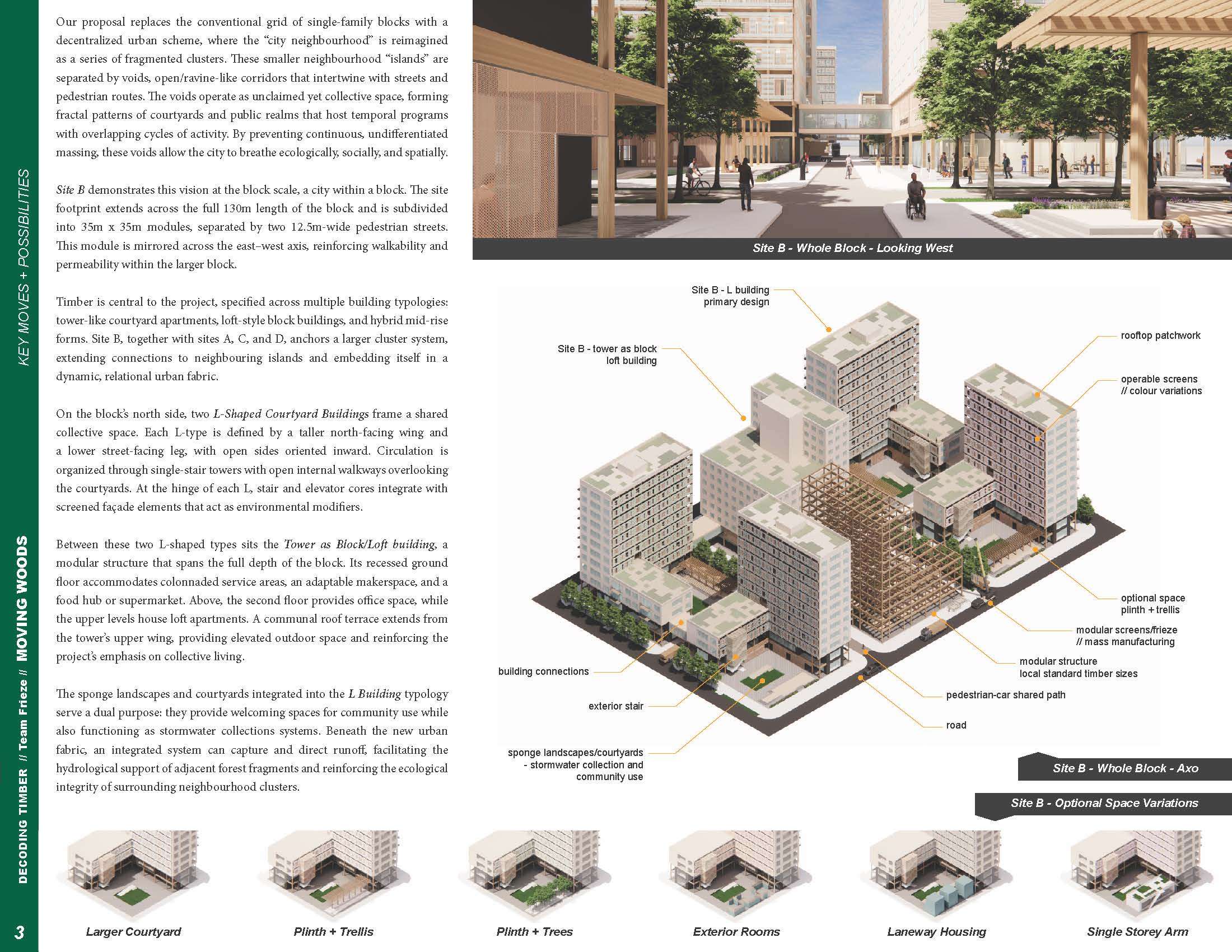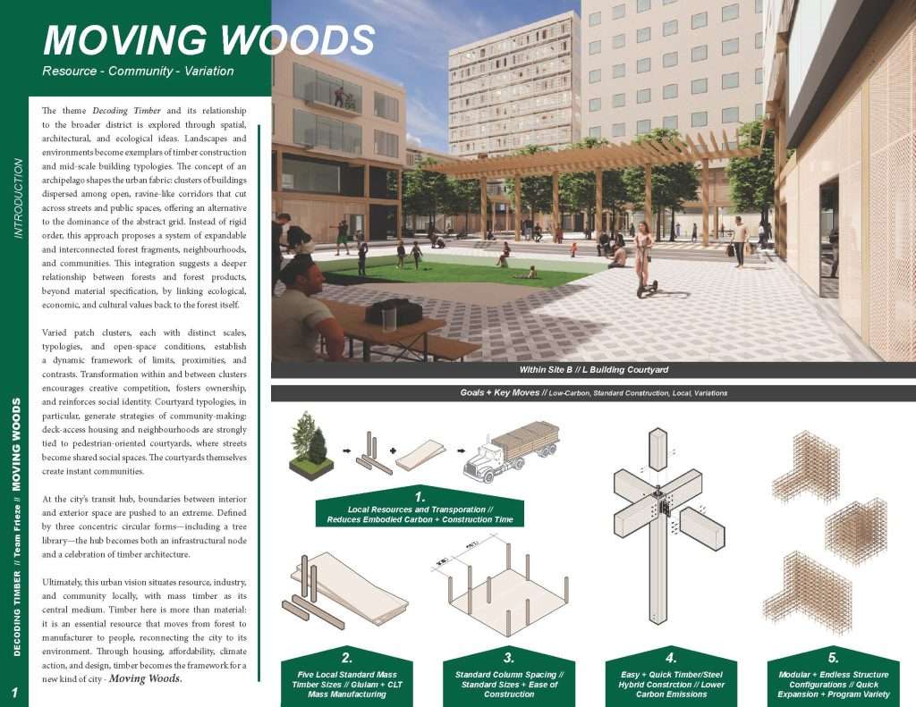Ultimately, this urban vision situates resource, industry, and community locally, with mass timber as its central medium. Timber here is more than material: it is an essential resource that moves from forest to manufacturer to people, reconnecting the city to its environment. Through housing, affordability, climate action, and design, timber becomes the framework for a new kind of city – Moving Woods.