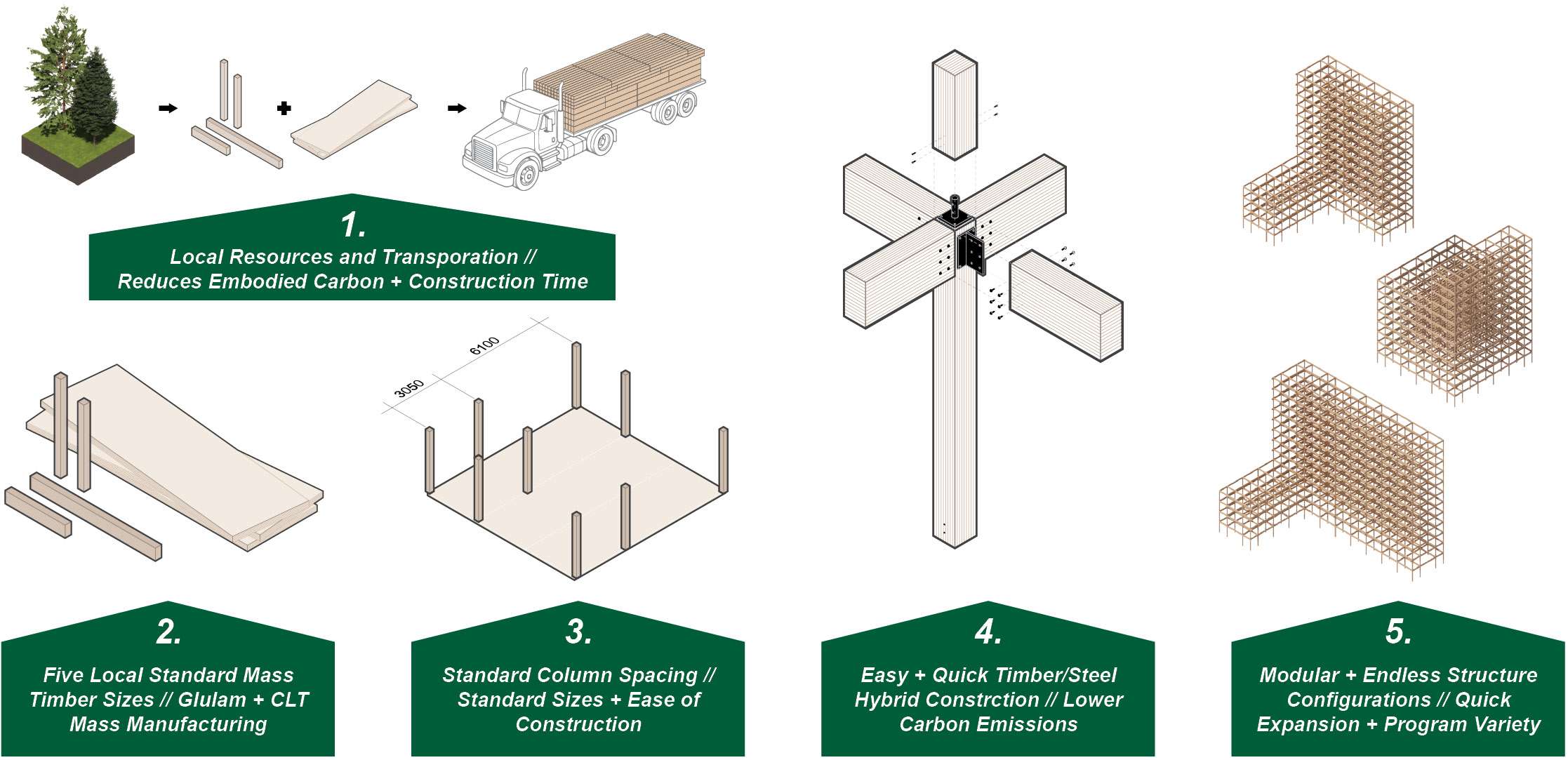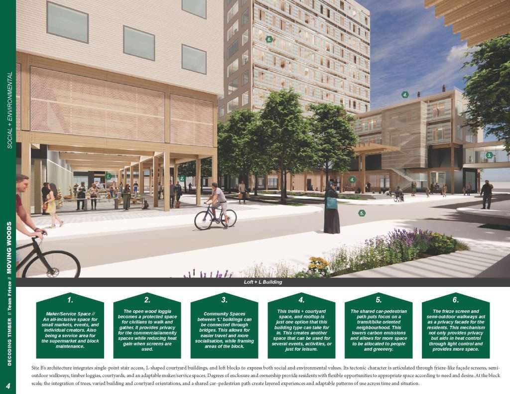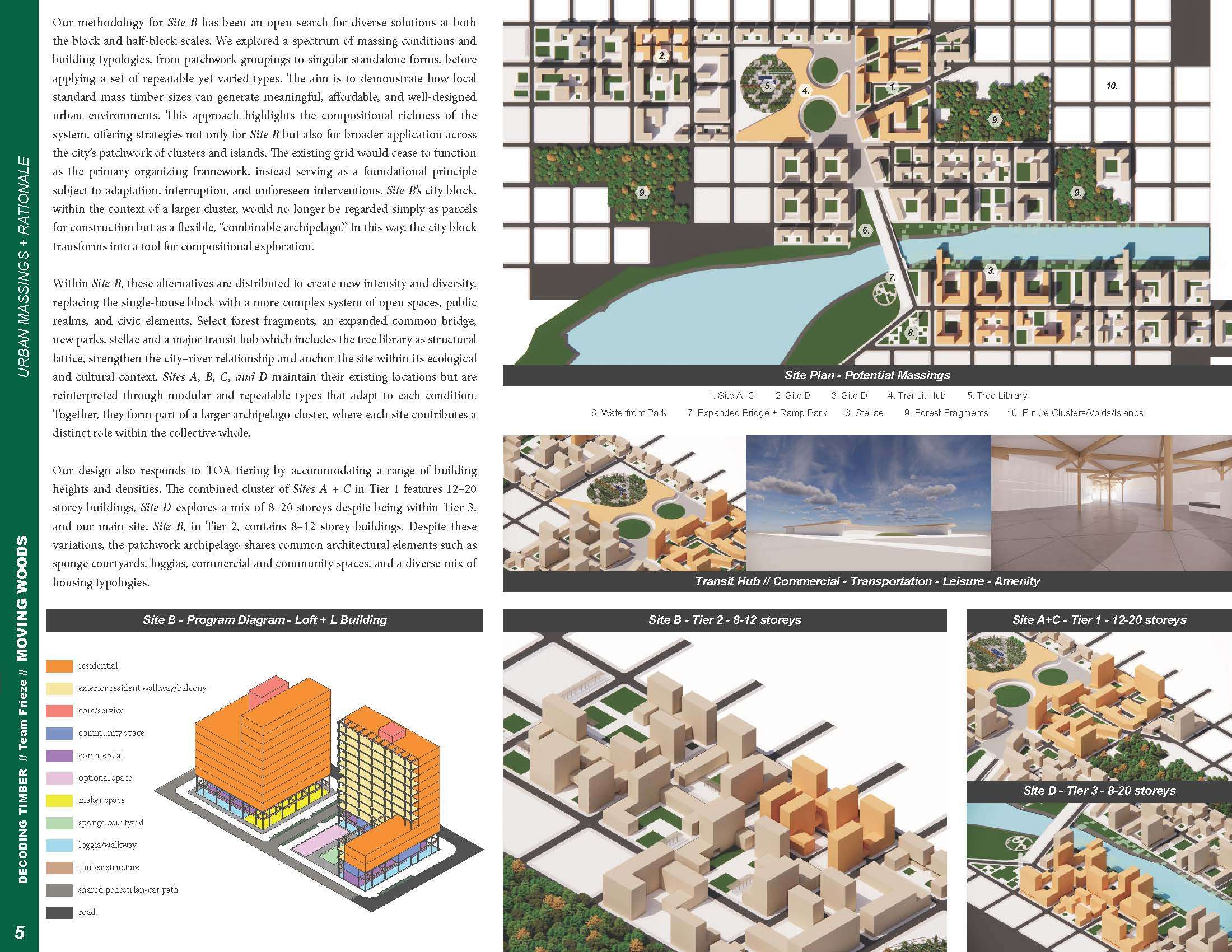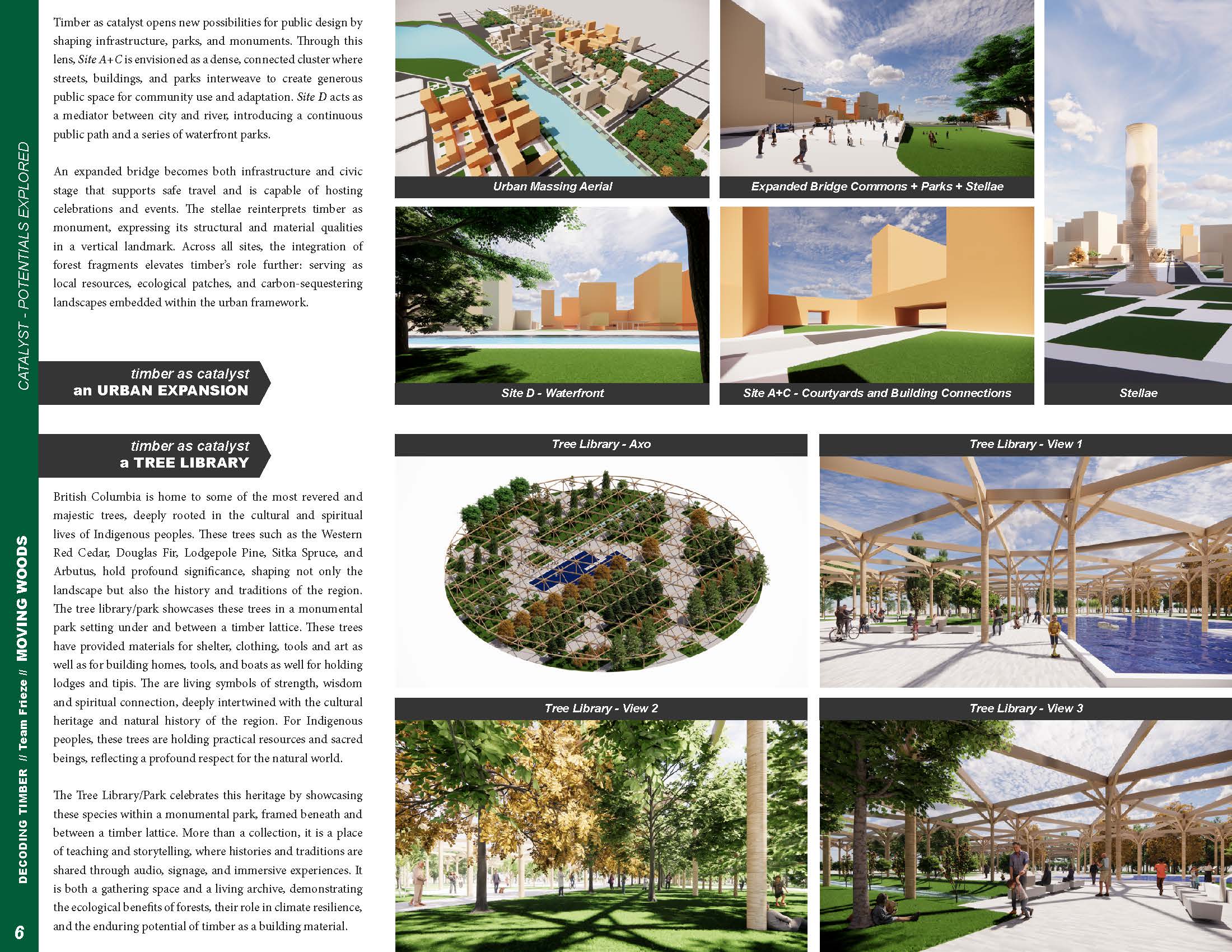 Ultimately, this urban vision situates resource, industry, and community locally, with mass timber as its central medium. Timber here is more than material: it is an essential resource that moves from forest to manufacturer to people, reconnecting the city to its environment. Through housing, affordability, climate action, and design, timber becomes the framework for a new kind of city – Moving Woods.