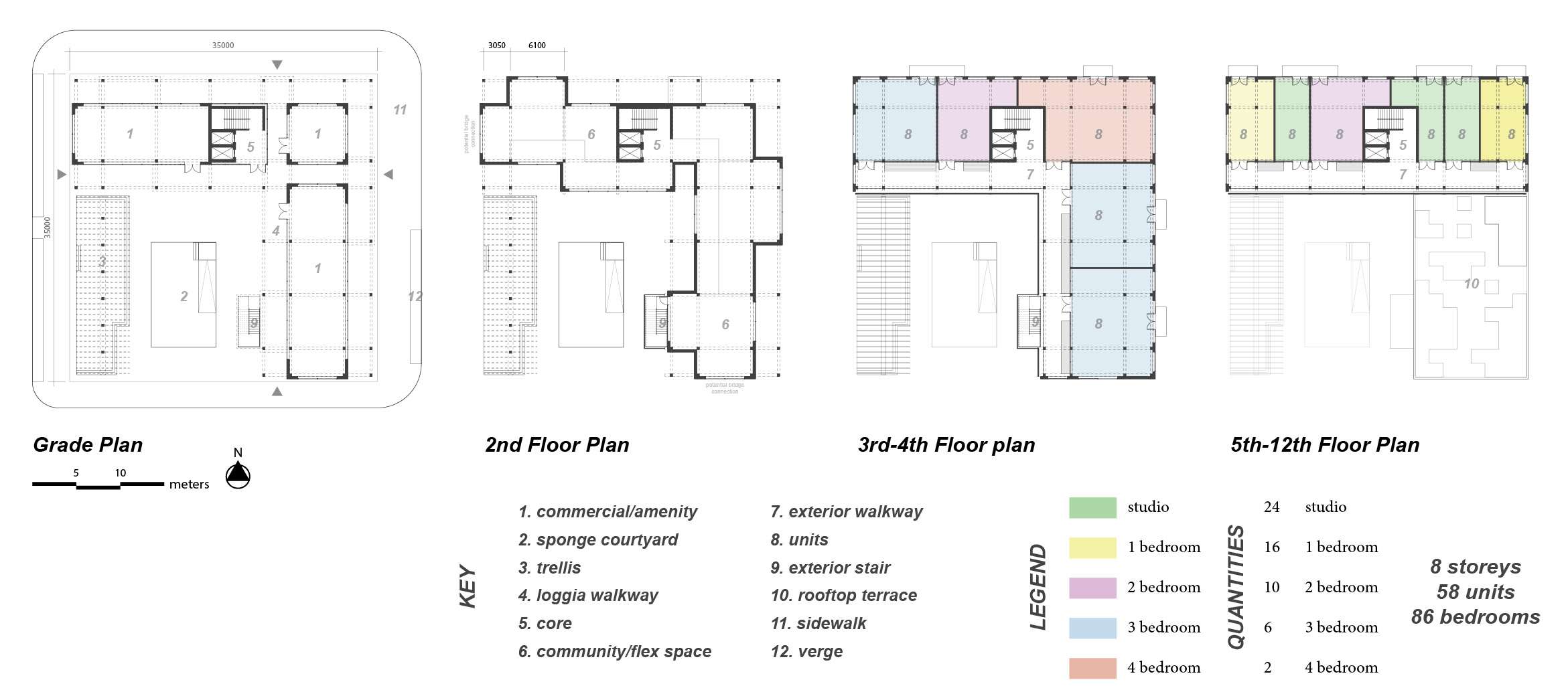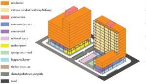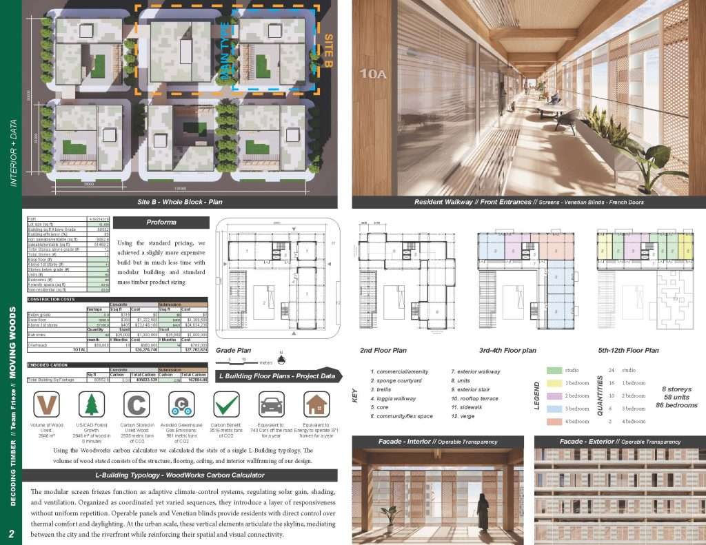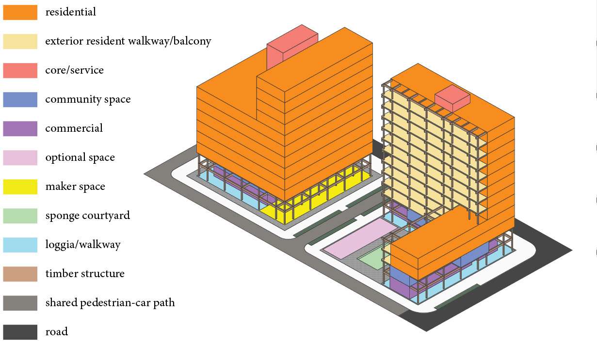 Site B’s architecture integrates single-point stair access, L-shaped courtyard buildings, and loft blocks to express both social and environmental values. Its tectonic character is articulated through frieze-like façade screens, semi-outdoor walkways, timber loggias, courtyards, and an adaptable maker/service spaces. Degrees of enclosure and ownership provide residents with flexible opportunities to appropriate space according to need and desire. At the block scale, the integration of trees, varied building and courtyard orientations, and a shared car–pedestrian path create layered experiences and adaptable patterns of use across time and situation.