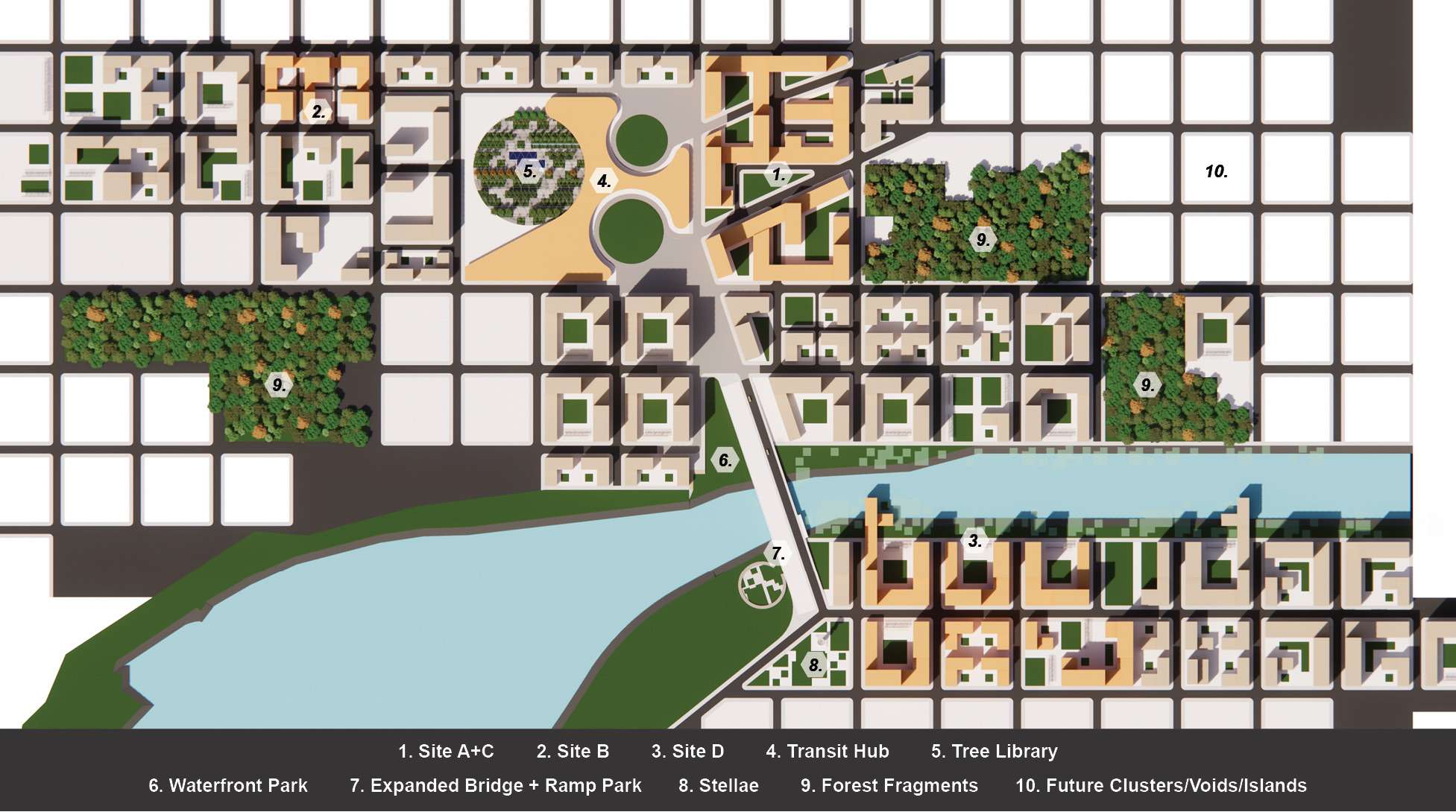 Within Site B, these alternatives are distributed to create new intensity and diversity, replacing the single-house block with a more complex system of open spaces, public realms, and civic elements. Select forest fragments, an expanded common bridge, new parks, stellae and a major transit hub which includes the tree library as structural lattice, strengthen the city–river relationship and anchor the site within its ecological and cultural context. Sites A, B, C, and D maintain their existing locations but are reinterpreted through modular and repeatable types that adapt to each condition. Together, they form part of a larger archipelago cluster, where each site contributes a distinct role within the collective whole.
