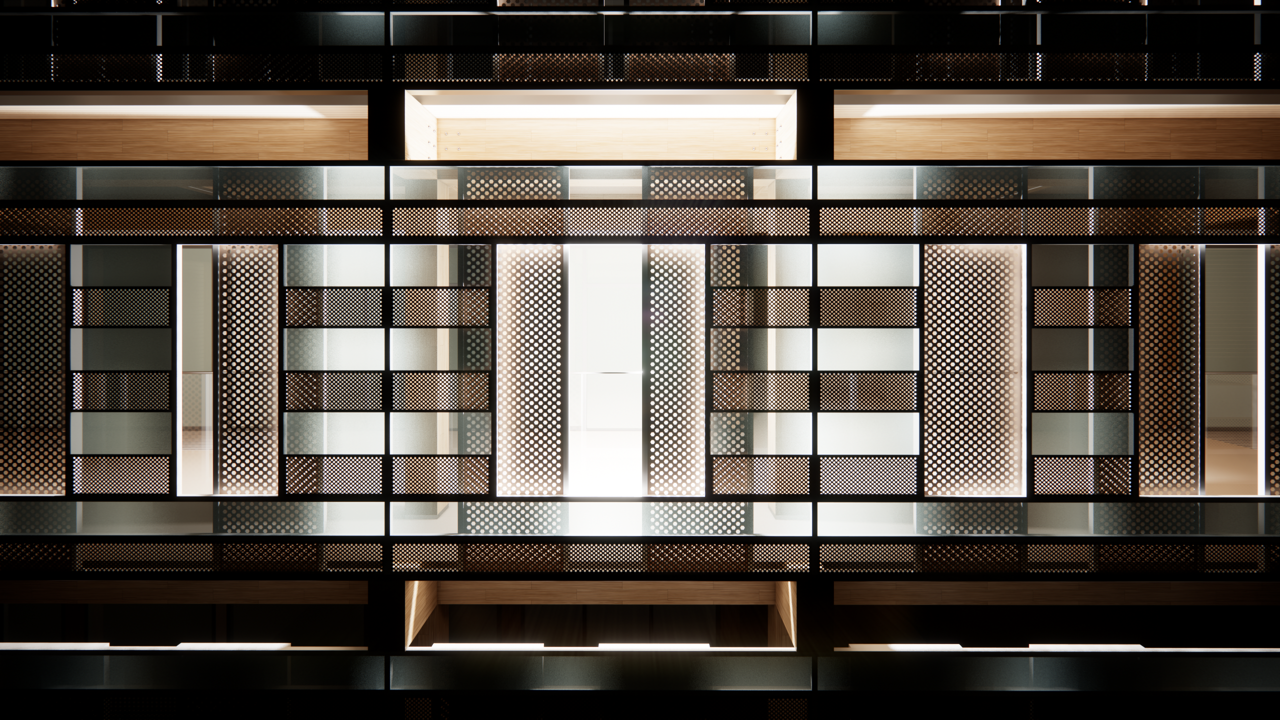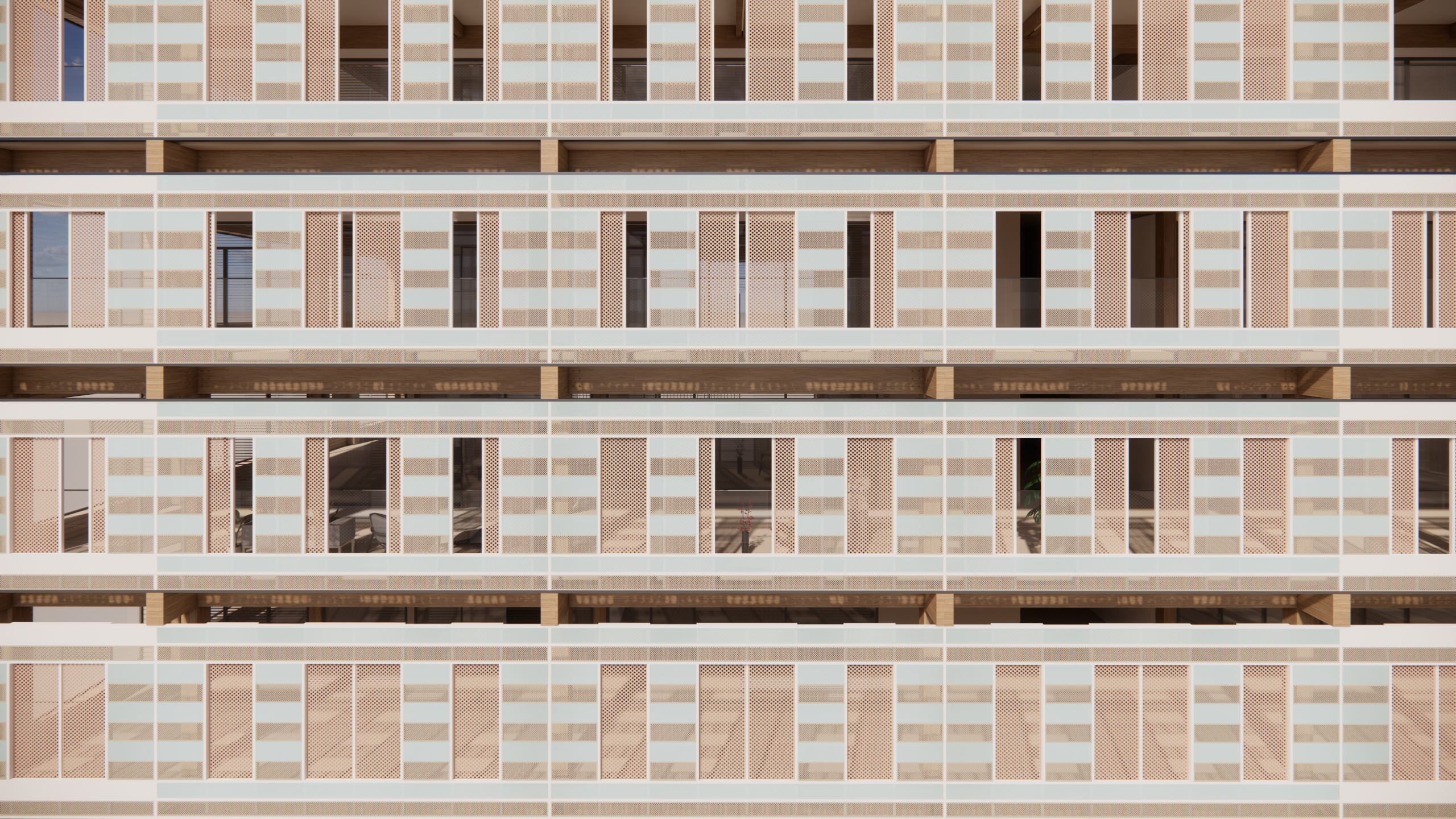The modular screen friezes function as adaptive climate-control systems, regulating solar gain, shading, and ventilation. Organized as coordinated yet varied sequences, they introduce a layer of responsiveness without uniform repetition. Operable panels and Venetian blinds provide residents with direct control over thermal comfort and daylighting. At the urban scale, these vertical elements articulate the skyline, mediating between the city and the riverfront while reinforcing their spatial and visual connectivity.