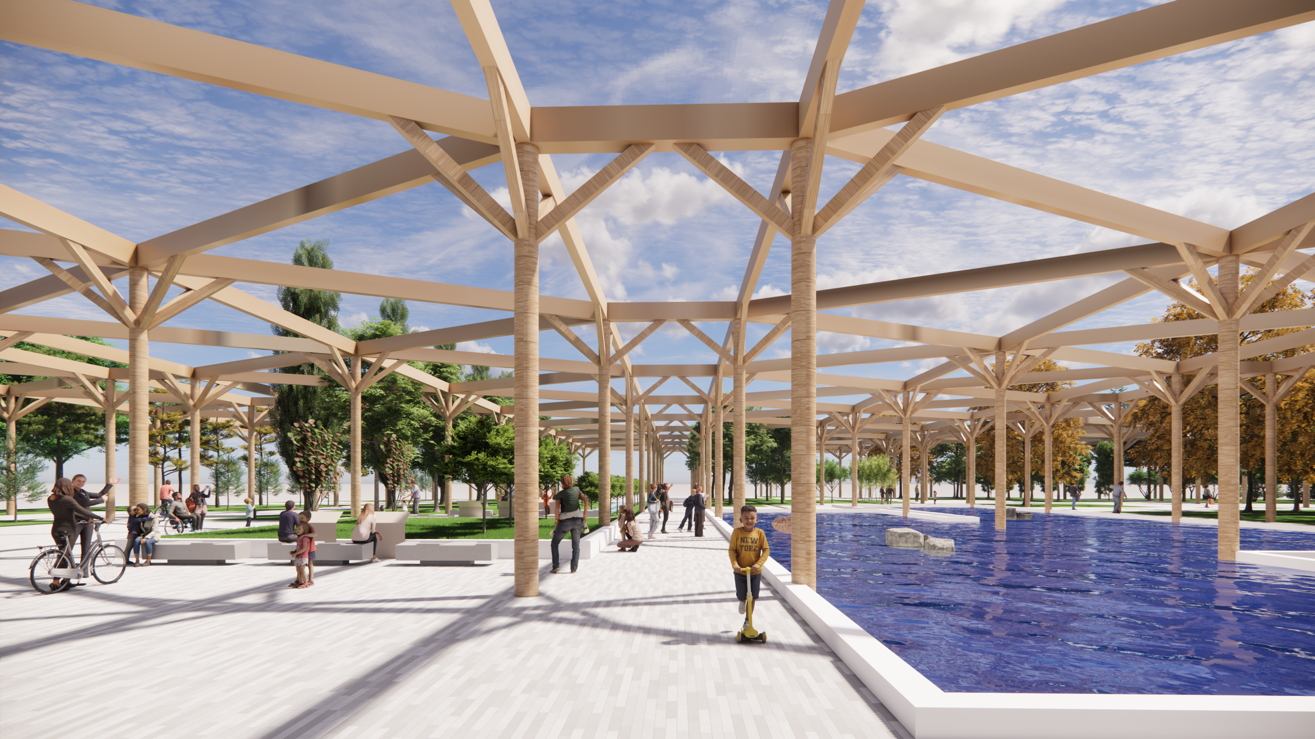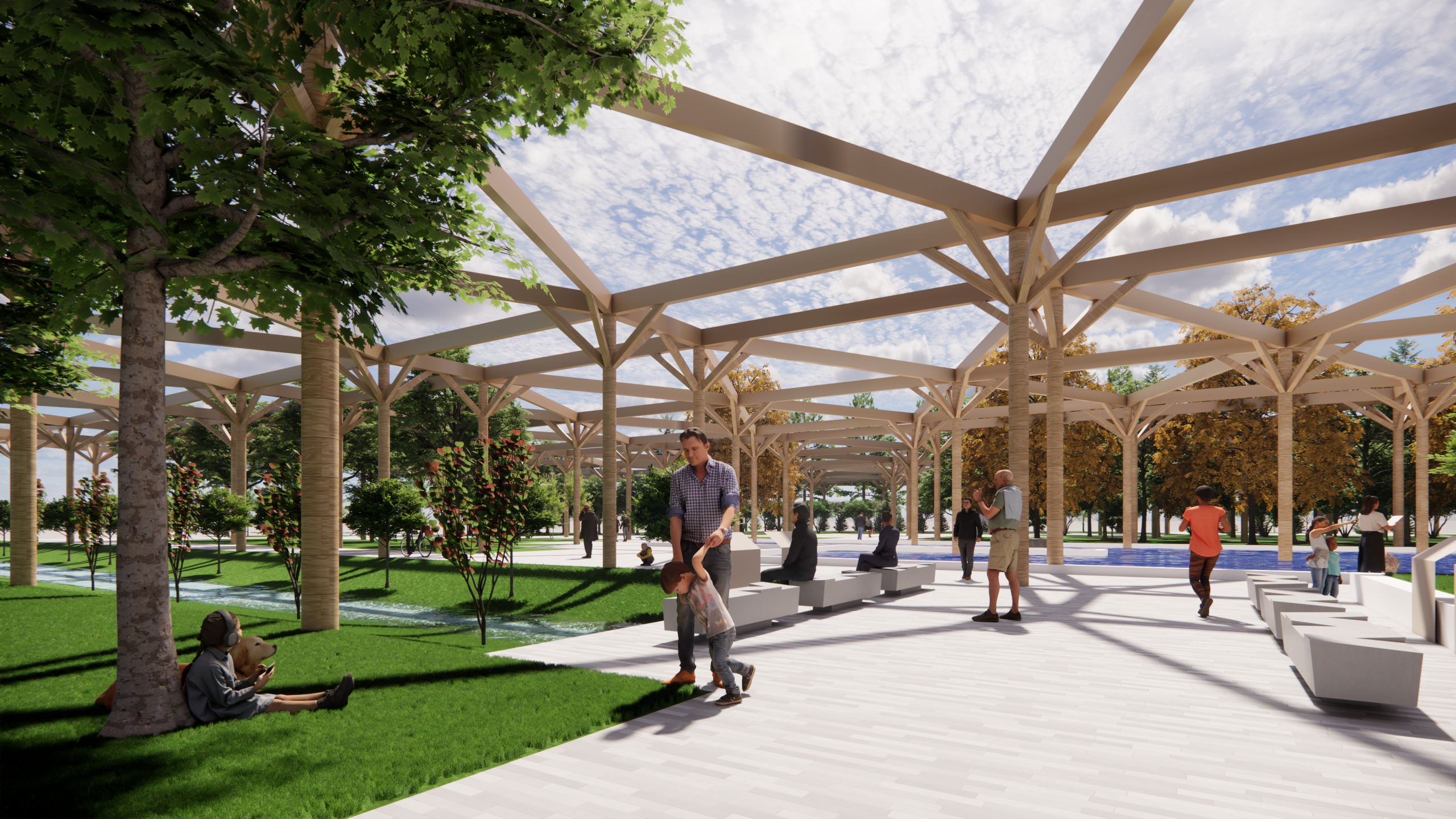 The Tree Library/Park celebrates this heritage by showcasing these species within a monumental park, framed beneath and between a timber lattice. More than a collection, it is a place of teaching and storytelling, where histories and traditions are shared through audio, signage, and immersive experiences. It is both a gathering space and a living archive, demonstrating the ecological benefits of forests, their role in climate resilience, and the enduring potential of timber as a building material.
