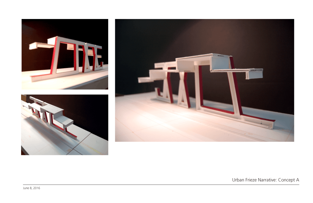 The frieze is legitimate architectural and historical narrative device for telling a story visually in an abbreviated utilization of symbols. It is usually linear in nature and relies on relief and profile. In particular, it is interpreted as a framing and compositional device; as a free standing element it enters into composition with its surroundings. These urban frieze concepts present ideas for architectural devices that function as bus stops, canopies, and elements of the public realm.